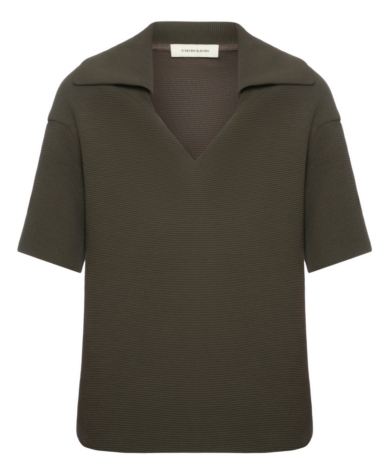 Khaki polo top from 0711 is an irresistible casual essential that is enjoyable to wear. Crafted from soft ribbed fabric to add a luxe touch to an athleisure-inspired profile, the piece is slightly cropped and features a V neckline along with the oversized collar, dropped shoulders and short sleeves.