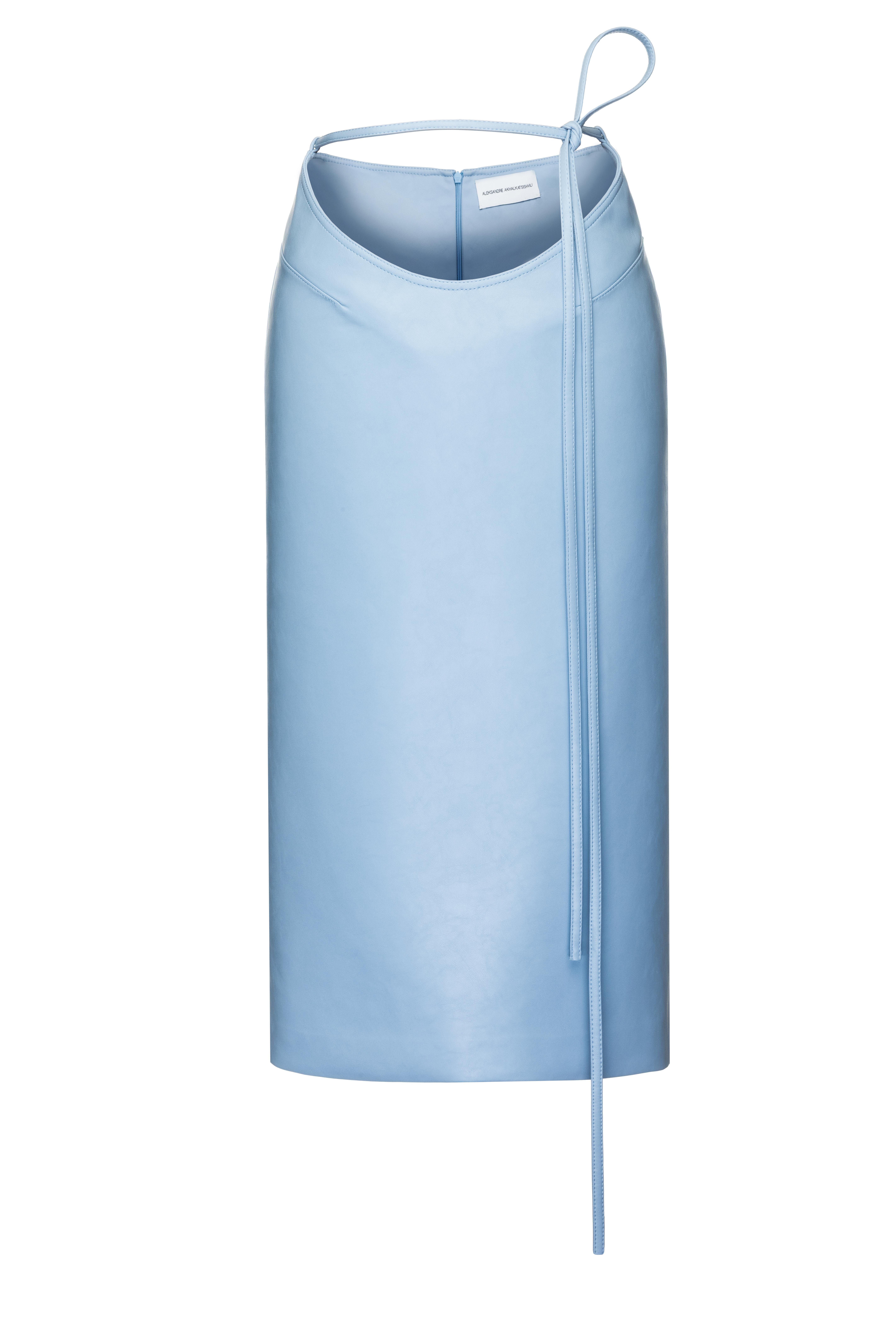 This sky blue mid-rise skirt features slanted side cutouts with self-ties, a concealed back zip, and a back slit that reveals a hint of skin — a signature blend of structure and sensuality from Aleksandre Akhalkatsishvili.