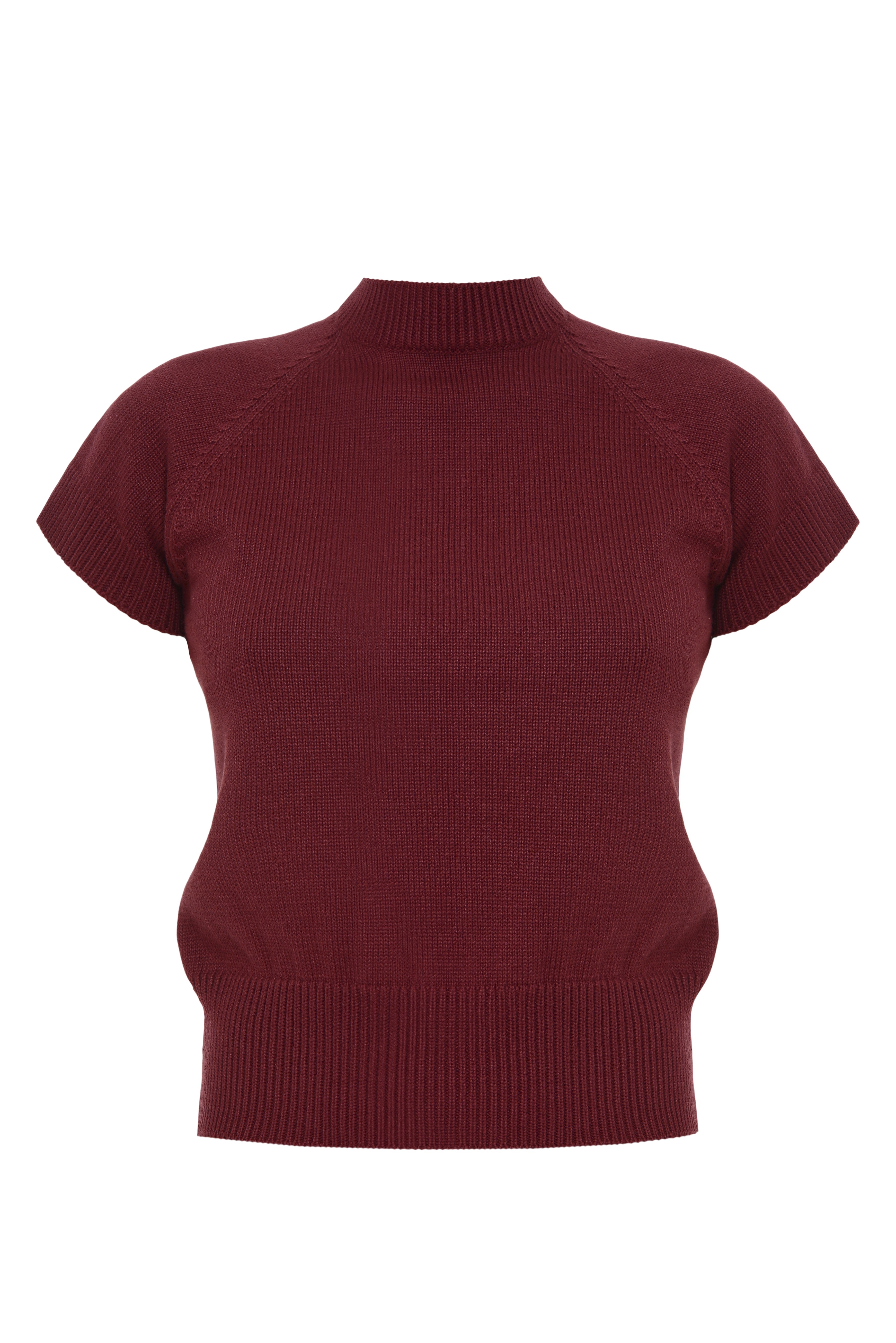 Burgundy short-sleeve high-neck sweater in a luxurious wool-cashmere blend, featuring a fitted silhouette for a refined, versatile look.