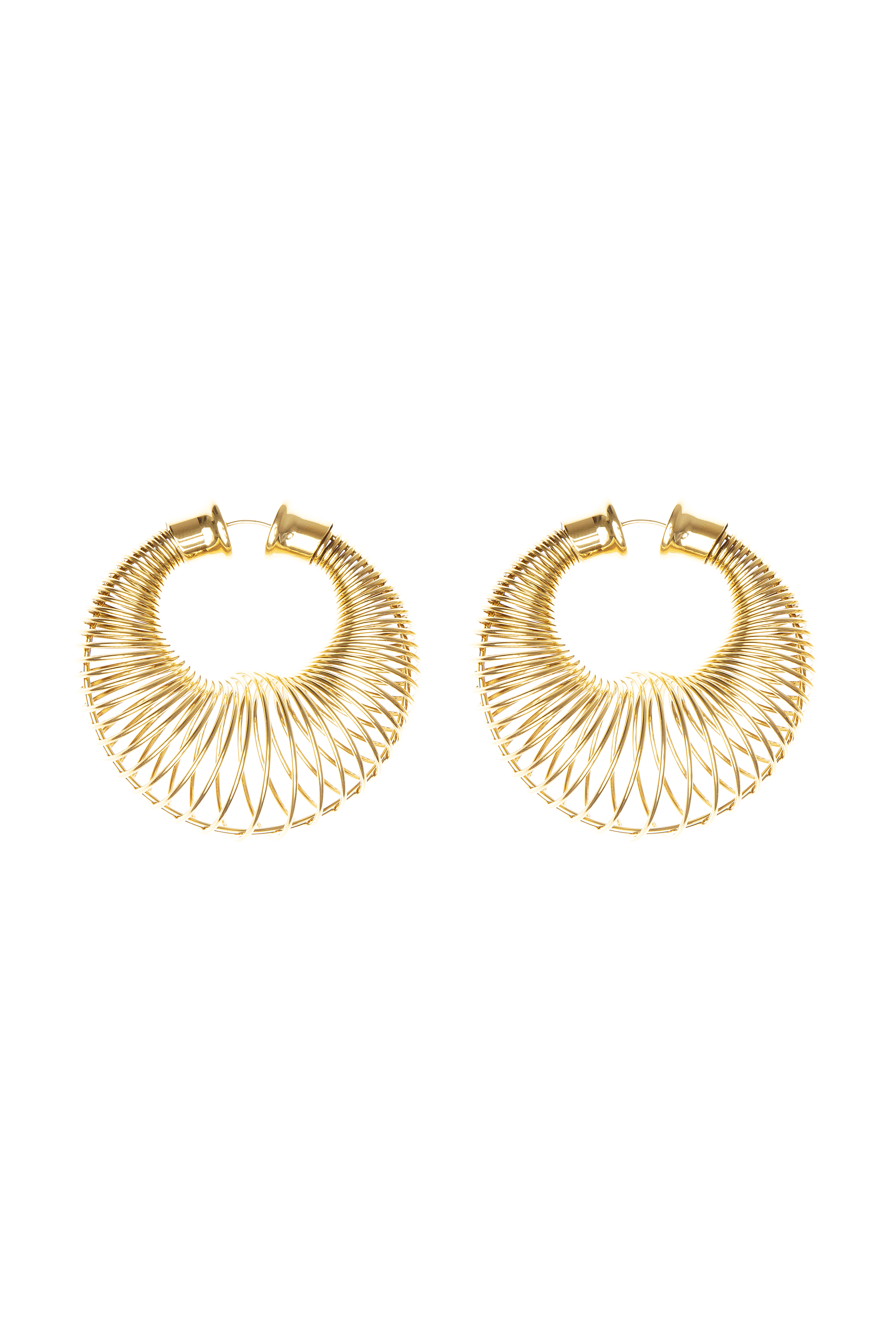 Add sculptural elegance to your accessories with these spiral hoop earrings from Ostras Collection. Crafted from 18 karat gold plated brass , the thin entwined wire creates a compact spring-like spiral, with a polished metal bead nestled at its centre. The design combines modern minimalism with subtle movement, offering a refined, tactile statement piece.