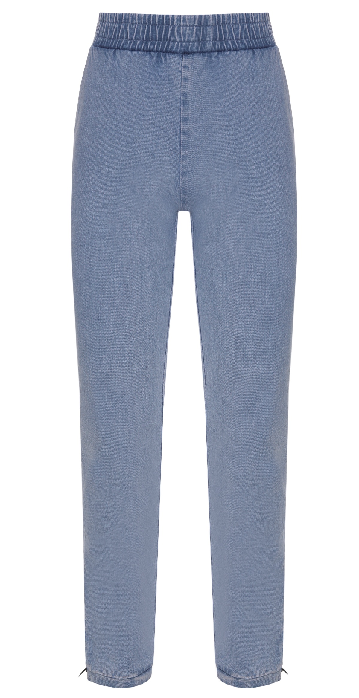 Light blue high-waisted denim track pants with elasticated waist, two slit pockets and drawstring at the hem.